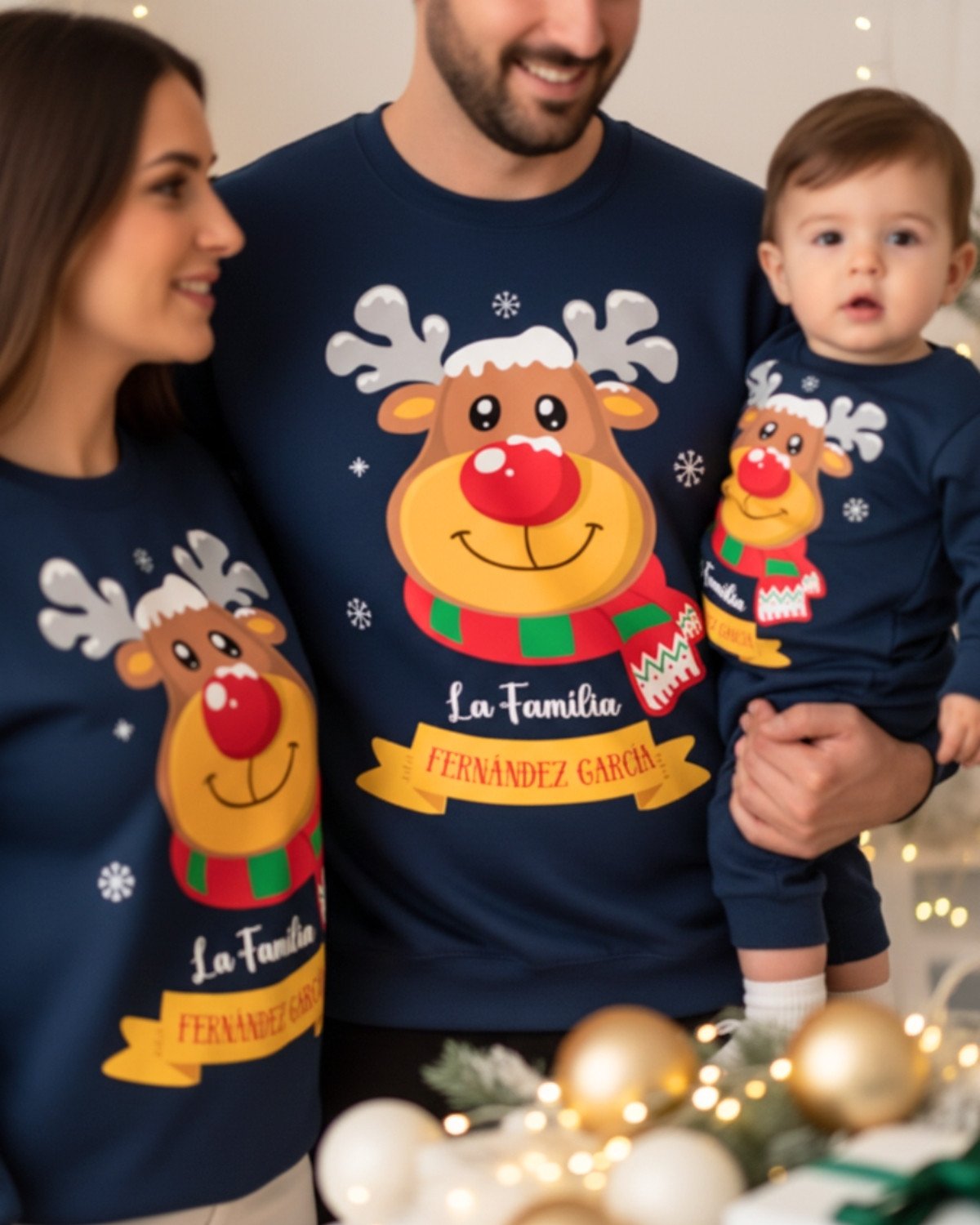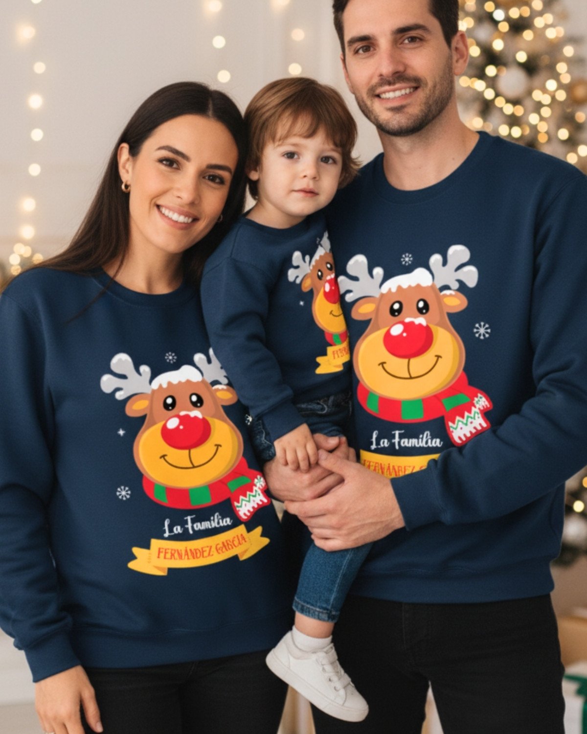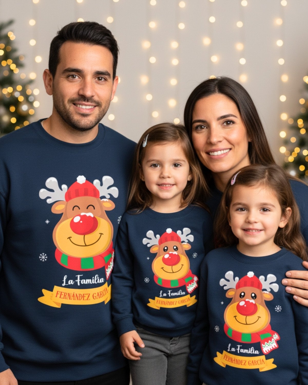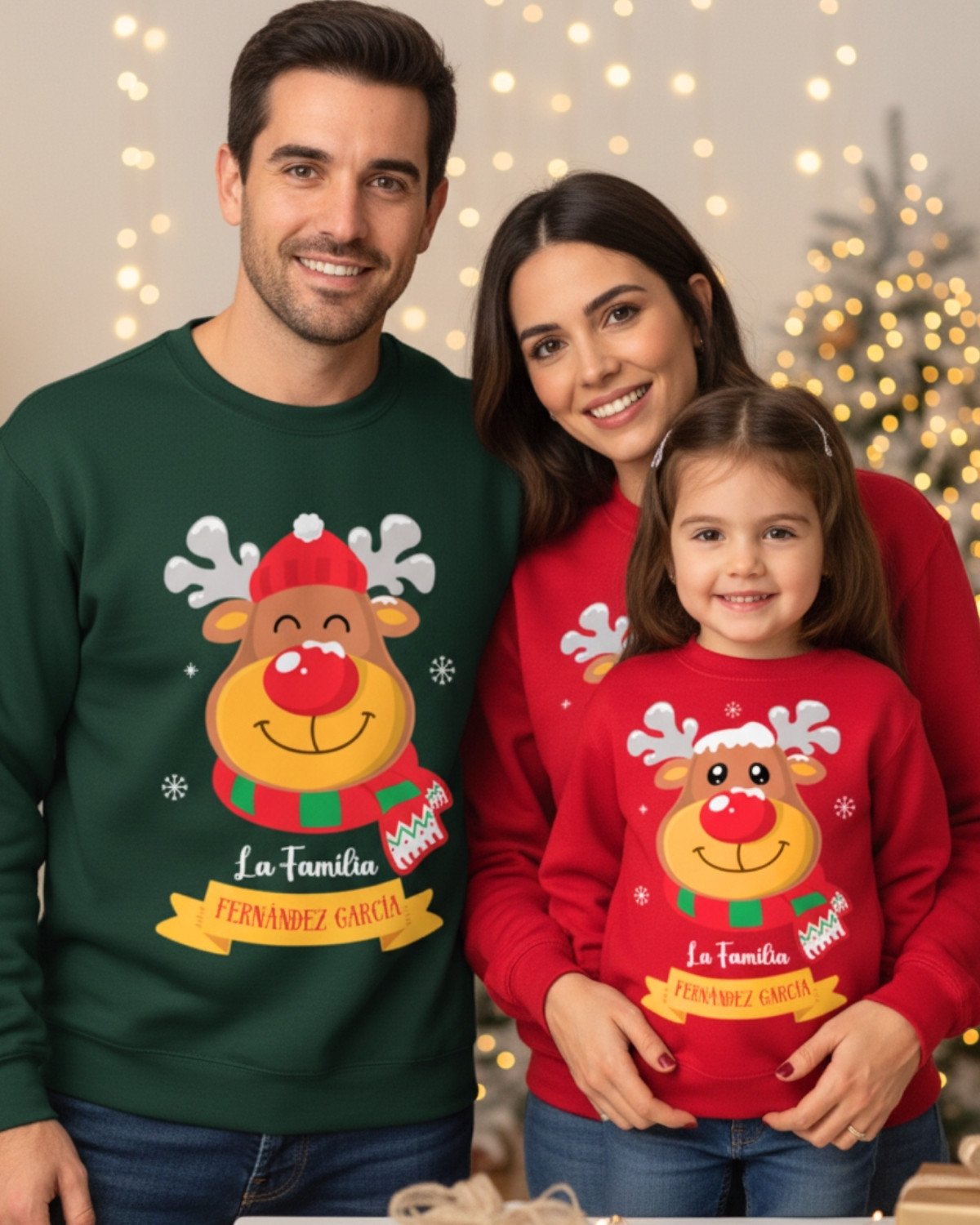 Jerséis de Navidad con renos adorables, personalizados para tu familia. Jerséis afelpados, muy suaves, cómodos y calentitos.